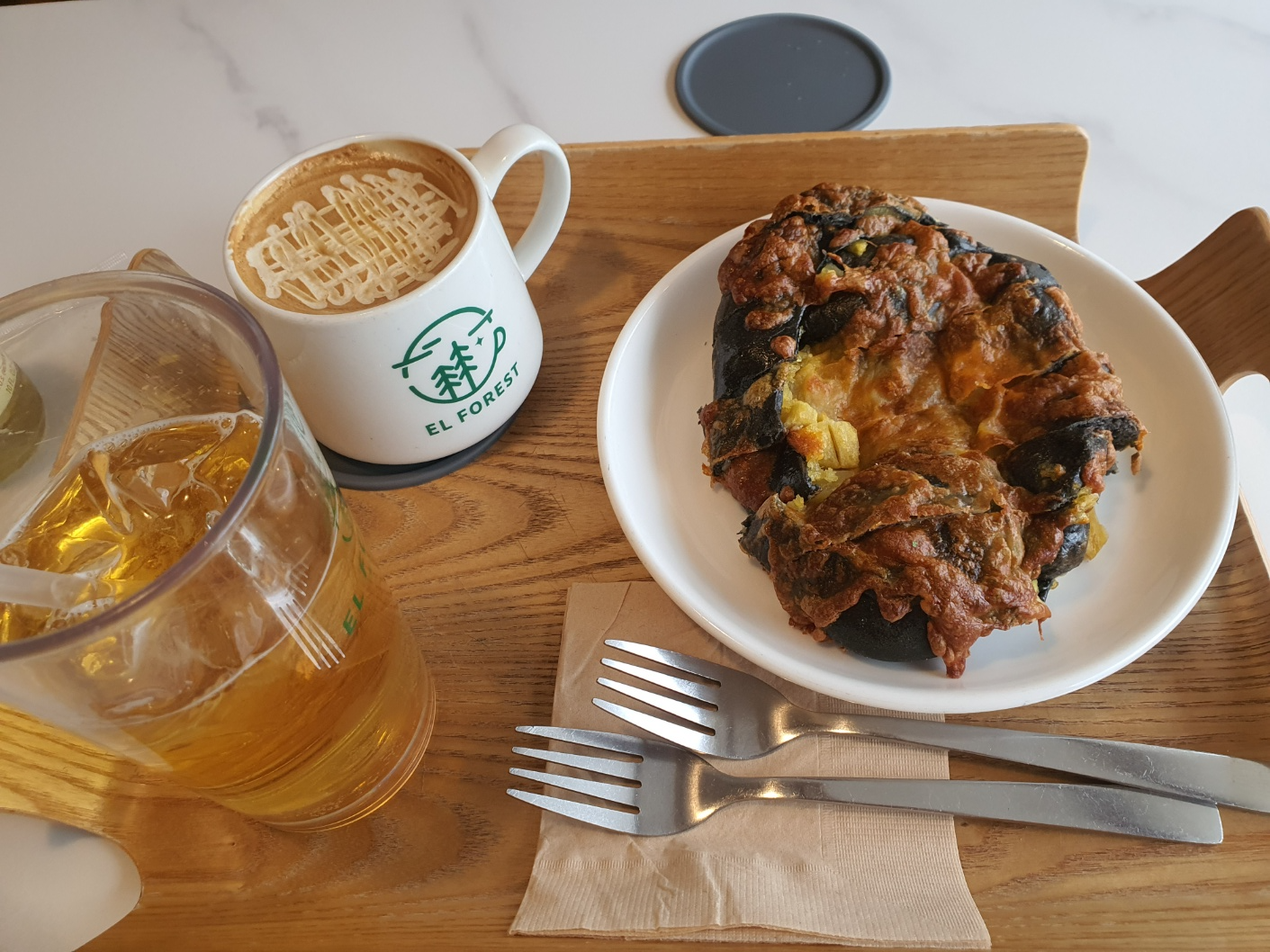 우리가 시킨 음료와 빵인데, 고구마가 토핑으로 들어가서 고소하고 달달하고 맛있었다. 빵도 맛있네? 커피는 달달하고 진했다.