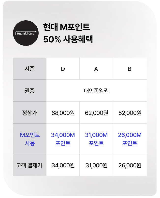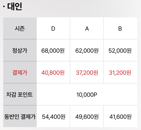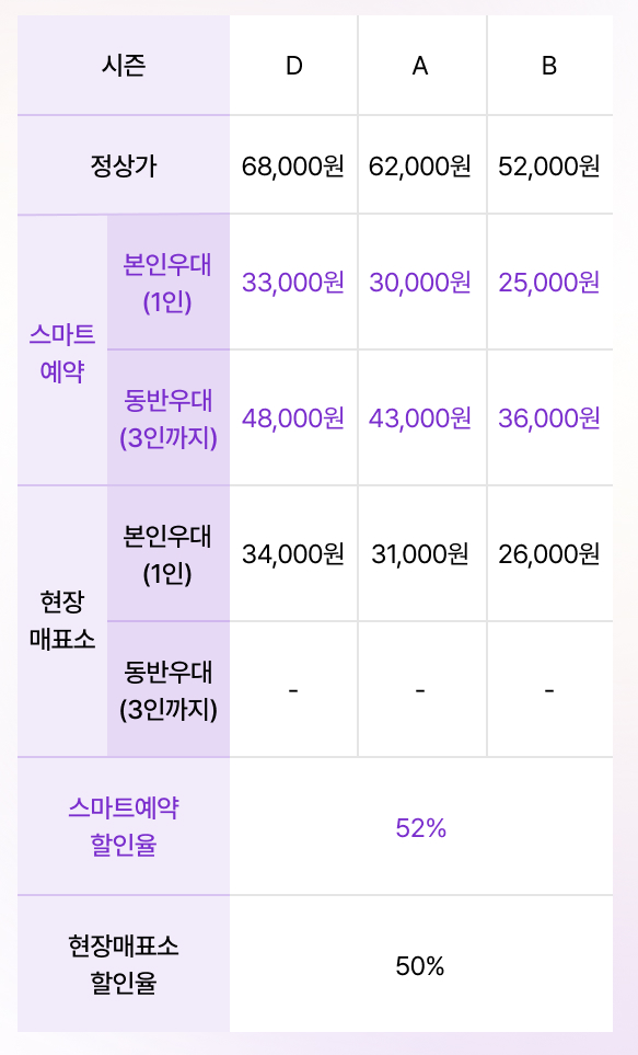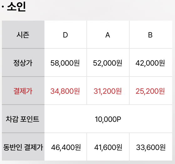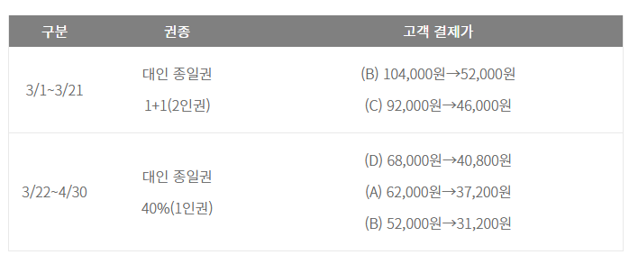 2. 시즌별로 (A,B,C,D) 할인율이 다르기 때문에 예약 전 확인이 필요합니다.